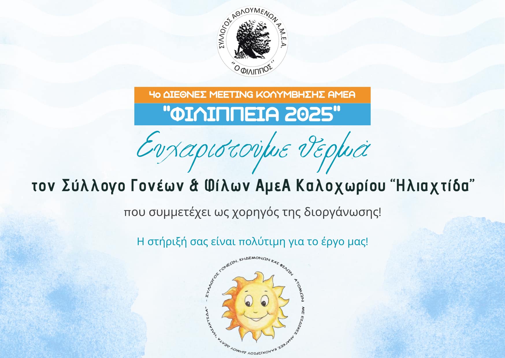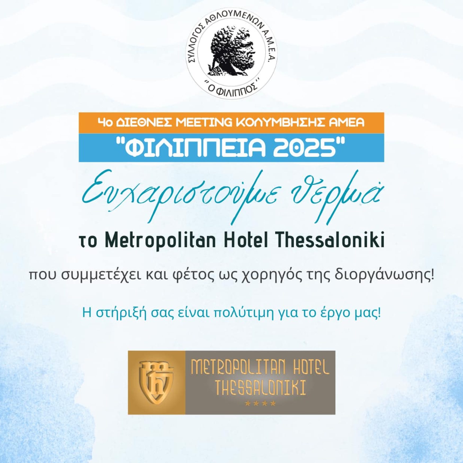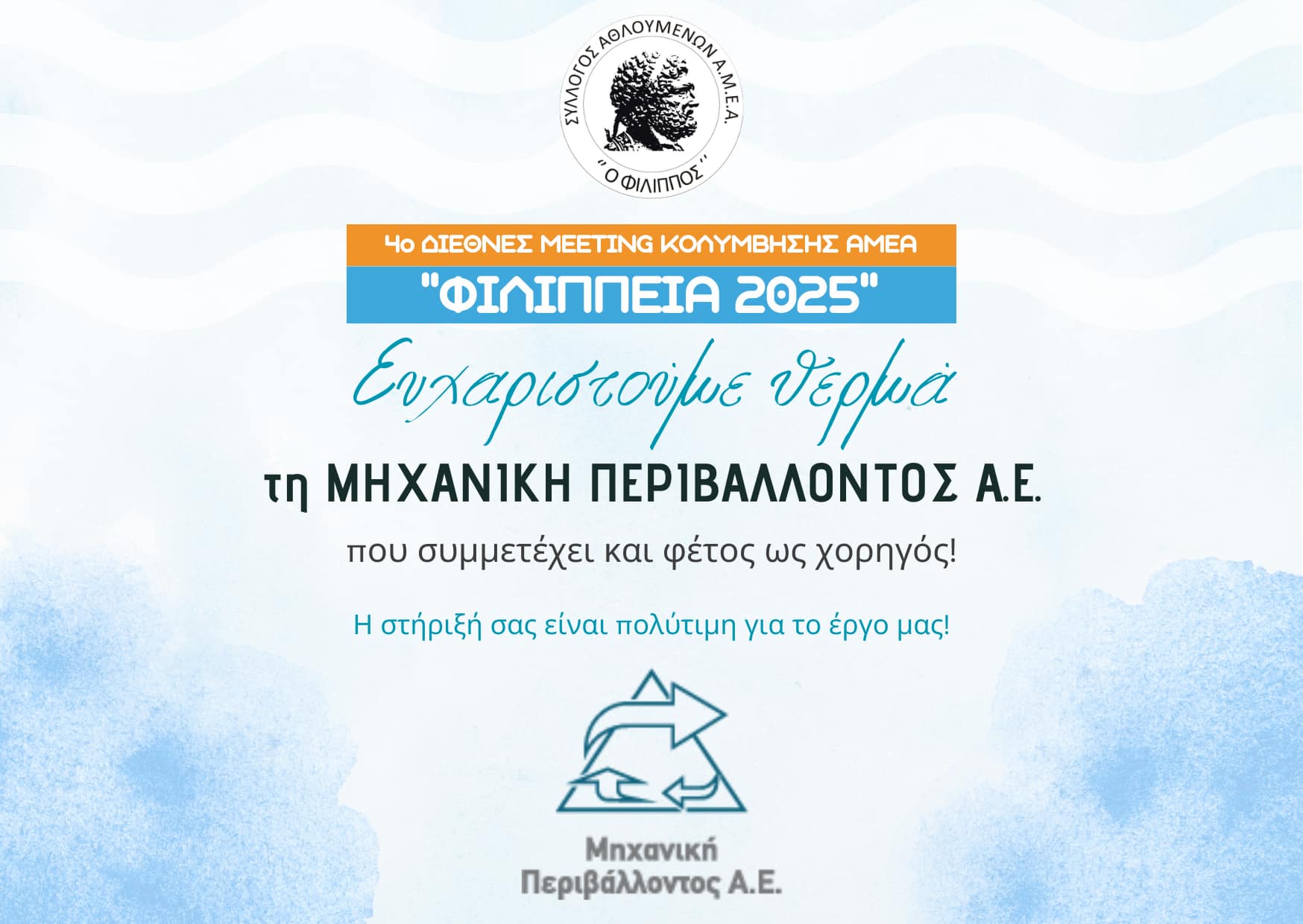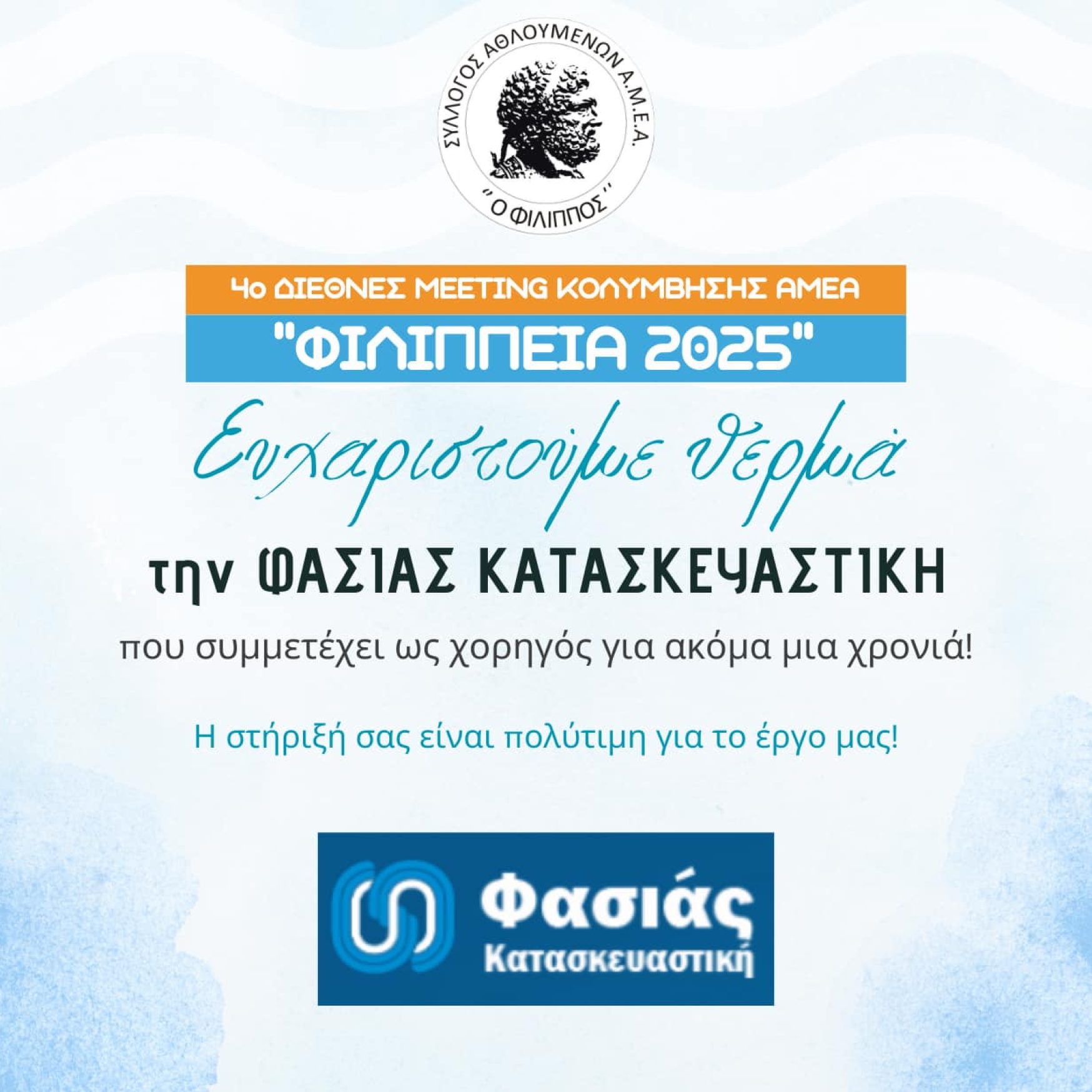 α θέλαμε να ευχαριστήσουμε θερμά του μεγάλους χορηγούς της διοργάνωσης 4α Φιλίππεια, Διεθνές Meeiting Κολύμβησης 2025 για την υποστήριξη τους!